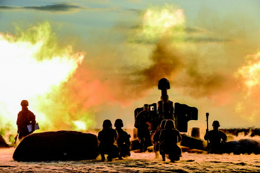 2017年8月25日,第74集團(tuán)軍某炮兵旅在西北戈壁組織實(shí)兵實(shí)彈戰(zhàn)術(shù)演習(xí),“志愿軍戰(zhàn)歌連”對(duì)“敵”實(shí)施火力打擊。新華社資料片
