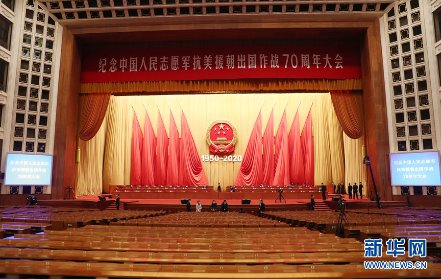 ??? 10月23日,紀(jì)念中國人民志愿軍抗美援朝出國作戰(zhàn)70周年大會在北京人民大會堂隆重舉行。圖為人民大會堂大禮堂。(新華網(wǎng) 翟子赫 攝)