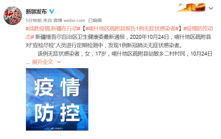 新疆維吾爾自治區(qū)衛(wèi)生健康委最新通報,2020年10月24日,喀什地區(qū)疏附縣對“應(yīng)檢盡檢”人員進行定期檢測中,發(fā)現(xiàn)1例新冠肺炎無癥狀感染者。