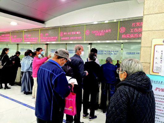 此時(shí),這家醫(yī)院唯一一個(gè)現(xiàn)場(chǎng)掛號(hào)的窗口——面向70周歲以上老年人的窗口,已經(jīng)排起了長(zhǎng)隊(duì)。老人們一個(gè)比一個(gè)來(lái)得早,仍有點(diǎn)兒神色緊張。