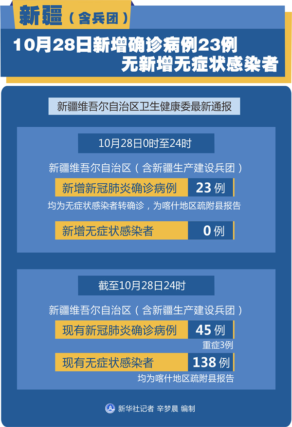 截至10月28日24時(shí),新疆(含兵團(tuán))現(xiàn)有確診病例45例(重癥3例),無(wú)癥狀感染者138例,均為喀什地區(qū)疏附縣報(bào)告。