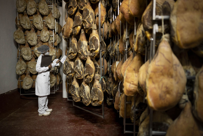 10月28日,在阿根廷首都布宜諾斯艾利斯附近的馬科斯·帕斯,一名工人檢查火腿的制作情況。這座人口僅有6萬多人的小鎮(zhèn)以城市之名報名參加第三屆進(jìn)博會。新華社發(fā)(馬丁·薩巴拉攝)