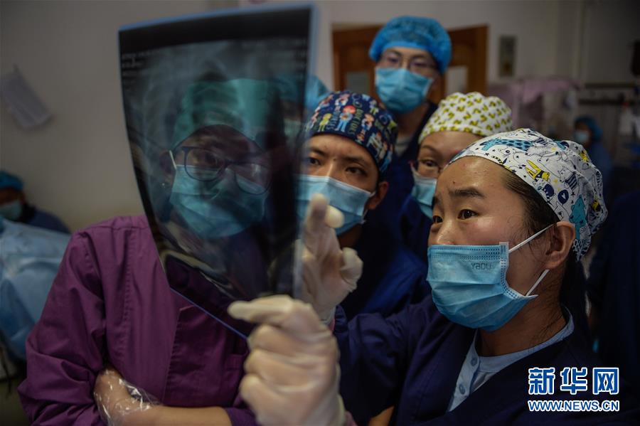 在西藏拉薩市人民醫(yī)院內(nèi),首都兒科研究所的援藏醫(yī)生韓同英(右一)進(jìn)行教學(xué)查房時,與徒弟們一起研究入院新生兒胸片(8月3日攝)。新華社記者 彭子洋 攝
