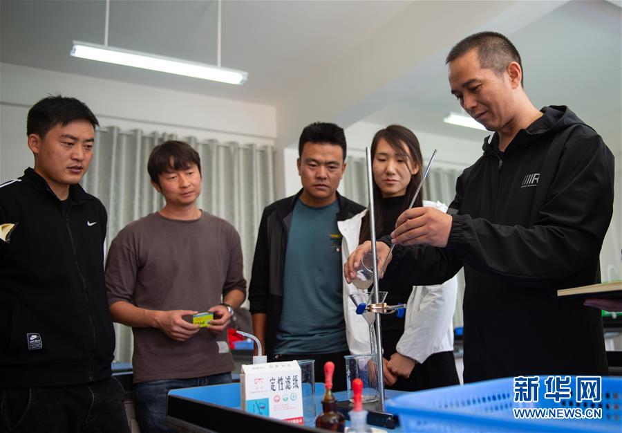 北京市援青支教教師、來自通州區(qū)陸辛莊學(xué)校的化學(xué)教師祁生貴(右一)在青海省玉樹州第四民族高級中學(xué)指導(dǎo)學(xué)校教師進(jìn)行實驗教學(xué)(8月12日攝)。新華社記者 陳鐘昊 攝
