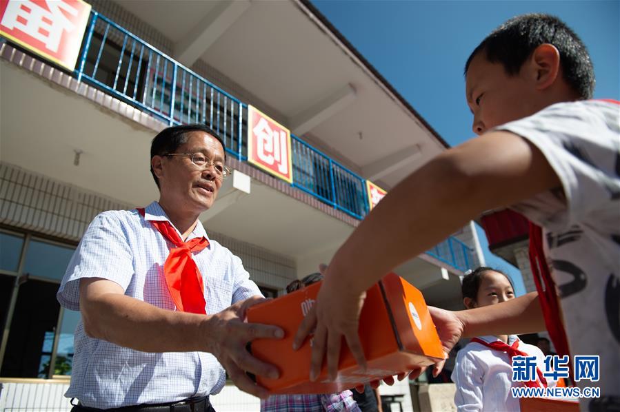 北京市西城區(qū)陶然亭小學(xué)退休老校長劉建文(左)在他支教的河北省阜平縣半溝小學(xué)開學(xué)典禮上給學(xué)生贈送學(xué)習(xí)用品(9月3日攝)。新華社記者 陳鐘昊 攝