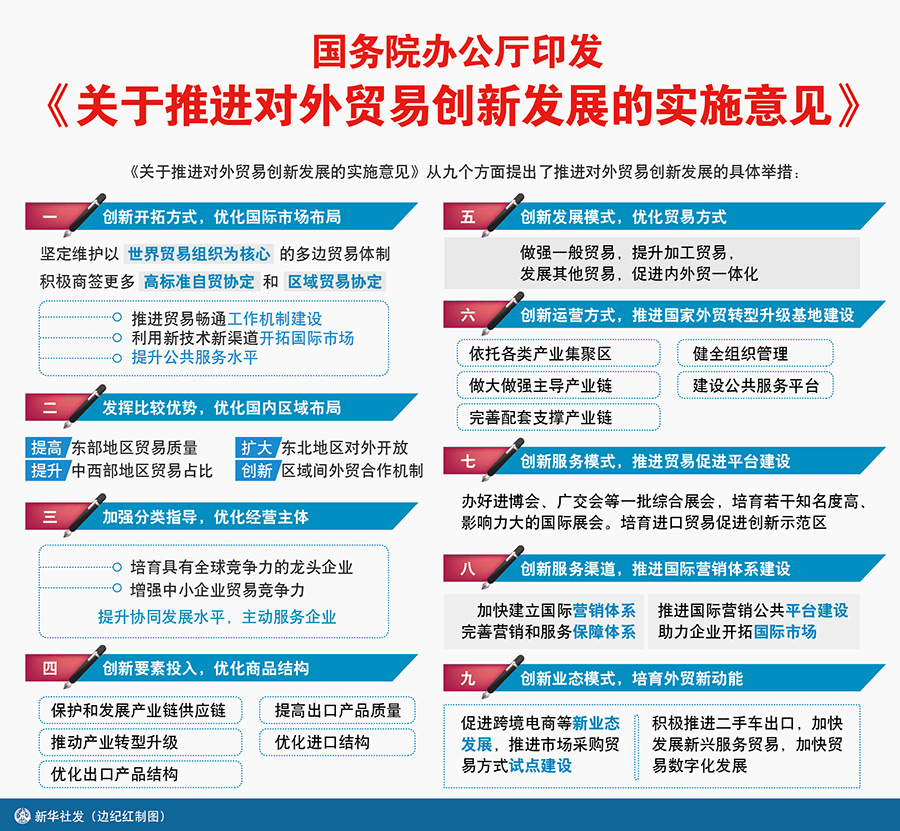 一是創(chuàng)新開拓方式,優(yōu)化國際市場(chǎng)布局。堅(jiān)定維護(hù)以世界貿(mào)易組織為核心的多邊貿(mào)易體制,積極商簽更多高標(biāo)準(zhǔn)自貿(mào)協(xié)定和區(qū)域貿(mào)易協(xié)定。推進(jìn)貿(mào)易暢通工作機(jī)制建設(shè),利用新技術(shù)新渠道開拓國際市場(chǎng),提升公共服務(wù)水平。二是發(fā)揮比較優(yōu)勢(shì),優(yōu)化國內(nèi)區(qū)域布局。提高東部地區(qū)貿(mào)易質(zhì)量,提升中西部地區(qū)貿(mào)易占比,擴(kuò)大東北地區(qū)對(duì)外開放,創(chuàng)新區(qū)域間外貿(mào)合作機(jī)制。三是加強(qiáng)分類指導(dǎo),優(yōu)化經(jīng)營主體。培育具有全球競(jìng)爭(zhēng)力的龍頭企業(yè),增強(qiáng)中小企業(yè)貿(mào)易競(jìng)爭(zhēng)力,提升協(xié)同發(fā)展水平,主動(dòng)服務(wù)企業(yè)。四是創(chuàng)新要素投入,優(yōu)化商品結(jié)構(gòu)。保護(hù)和發(fā)展產(chǎn)業(yè)鏈供應(yīng)鏈,推動(dòng)產(chǎn)業(yè)轉(zhuǎn)型升級(jí),優(yōu)化出口產(chǎn)品結(jié)構(gòu),提高出口產(chǎn)品質(zhì)量,優(yōu)化進(jìn)口結(jié)構(gòu)。五是創(chuàng)新發(fā)展模式,優(yōu)化貿(mào)易方式。做強(qiáng)一般貿(mào)易,提升加工貿(mào)易,發(fā)展其他貿(mào)易,促進(jìn)內(nèi)外貿(mào)一體化。六是創(chuàng)新運(yùn)營方式,推進(jìn)國家外貿(mào)轉(zhuǎn)型升級(jí)基地建設(shè)。依托各類產(chǎn)業(yè)集聚區(qū),做大做強(qiáng)主導(dǎo)產(chǎn)業(yè)鏈,完善配套支撐產(chǎn)業(yè)鏈,健全組織管理,建設(shè)公共服務(wù)平臺(tái)。七是創(chuàng)新服務(wù)模式,推進(jìn)貿(mào)易促進(jìn)平臺(tái)建設(shè)。辦好進(jìn)博會(huì)、廣交會(huì)等一批綜合展會(huì),培育若干知名度高、影響力大的國際展會(huì)。培育進(jìn)口貿(mào)易促進(jìn)創(chuàng)新示范區(qū)。八是創(chuàng)新服務(wù)渠道,推進(jìn)國際營銷體系建設(shè)。加快建立國際營銷體系,完善營銷和服務(wù)保障體系。推進(jìn)國際營銷公共平臺(tái)建設(shè),助力企業(yè)開拓國際市場(chǎng)。九是創(chuàng)新業(yè)態(tài)模式,培育外貿(mào)新動(dòng)能。促進(jìn)跨境電商等新業(yè)態(tài)發(fā)展,推進(jìn)市場(chǎng)采購貿(mào)易方式試點(diǎn)建設(shè)。積極推進(jìn)二手車出口,加快發(fā)展新興服務(wù)貿(mào)易,加快貿(mào)易數(shù)字化發(fā)展。