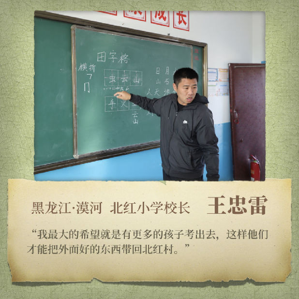 這所位于黑龍江省漠河市北極鎮(zhèn)北紅村的北紅小學(xué)只有兩位老師、3個(gè)年級(jí)和11名學(xué)生?!?0后”校長(zhǎng)王忠雷每天在數(shù)學(xué)、體育、思想品德三個(gè)科目中“周旋”。打開課件,他向?qū)W生熟練講授“體積與容積”相關(guān)知識(shí)的時(shí)候,隔壁教室傳來(lái)妻子于晶的語(yǔ)文課上孩子們瑯瑯的讀書聲……