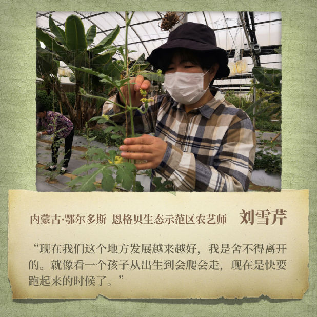 2009年初,大學(xué)畢業(yè)剛半年的劉雪芹來(lái)到恩格貝。彼時(shí),面對(duì)有技術(shù)門檻的設(shè)施農(nóng)業(yè),當(dāng)?shù)貛缀鯖](méi)有熟練工人,種植、育苗都需要?jiǎng)⒀┣凼职咽纸?。草業(yè)科學(xué)專業(yè)畢業(yè)的劉雪芹克服著環(huán)境、氣候等困難,同時(shí)也懂得借助自然的力量。