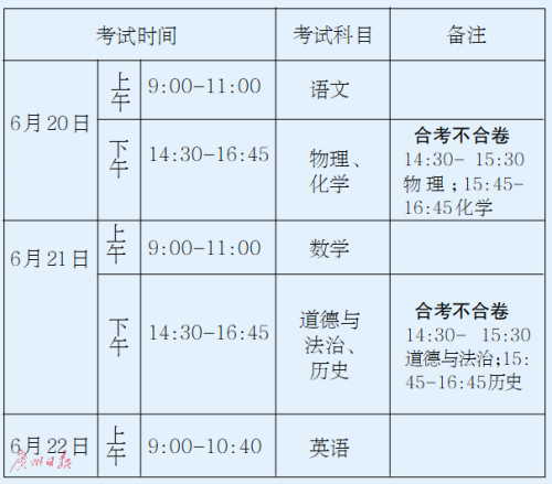 2021年至2023年廣州市初中學(xué)業(yè)水平考試錄取計(jì)分科目考試安排在每年的6月20日至22日進(jìn)行。錄取計(jì)分科目采用“4+4”模式,新增歷史科考試,分值為90分,體育分值提升至70分。語、數(shù)、英各科分值調(diào)整為120分。道德與法治分值調(diào)整為90分。物理和化學(xué)分值不變,各100分。
