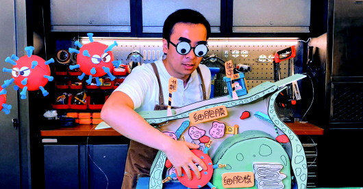“新型冠狀病毒在細胞外面游走過程中,總能找到對應的鎖眼,咔嚓,打開細胞上的鎖,天真的細胞誤以為營養(yǎng)物質來了,于是大門敞開……”在一個約4分鐘的視頻中,寧原在工作間的長桌上用自己制作的病毒、細胞等模型,為粉絲趣味介紹新型冠狀病毒是如何入侵人體的。他還邀請武漢大學醫(yī)學部病毒學研究所專家來釋疑病毒變異的相關問題,那期視頻獲得了500多萬次觀看量。
