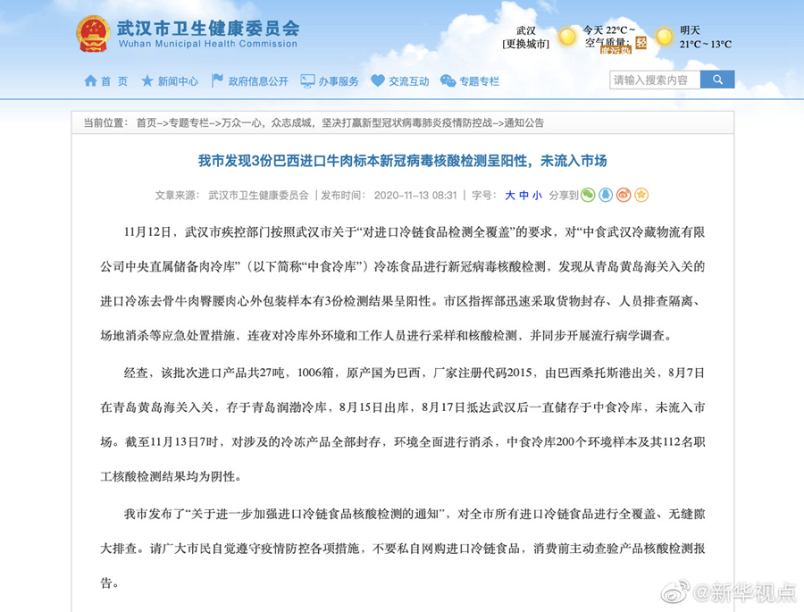 經(jīng)查,該批次進口產(chǎn)品共27噸,1006箱,原產(chǎn)國為巴西,廠家注冊代碼2015,由巴西桑托斯港出關(guān),8月7日在青島黃島海關(guān)入關(guān),存于青島潤渤冷庫,8月15日出庫,8月17日抵達武漢后一直儲存于中食冷庫,未流入市場。截至11月13日7時,對涉及的冷凍產(chǎn)品全部封存,環(huán)境全面進行消殺,中食冷庫200個環(huán)境樣本及其112名職工核酸檢測結(jié)果均為陰性。