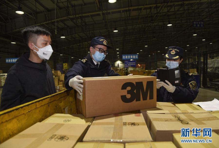 抗擊新冠疫情期間,成都海關(guān)關(guān)員在雙流機(jī)場口岸查驗(yàn)防護(hù)物資,做到即到即提,實(shí)現(xiàn)疫情物資通關(guān)“零延時”(1月30日攝)。新華社記者 劉坤 攝
