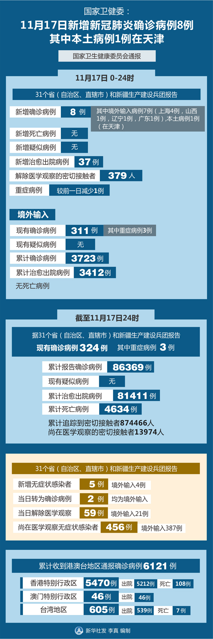截至11月17日24時(shí),據(jù)31個(gè)?。ㄗ灾螀^(qū)、直轄市)和新疆生產(chǎn)建設(shè)兵團(tuán)報(bào)告,現(xiàn)有確診病例324例(其中重癥病例3例),累計(jì)治愈出院病例81411例,累計(jì)死亡病例4634例,累計(jì)報(bào)告確診病例86369例,無現(xiàn)有疑似病例。累計(jì)追蹤到密切接觸者874466人,尚在醫(yī)學(xué)觀察的密切接觸者13974人。