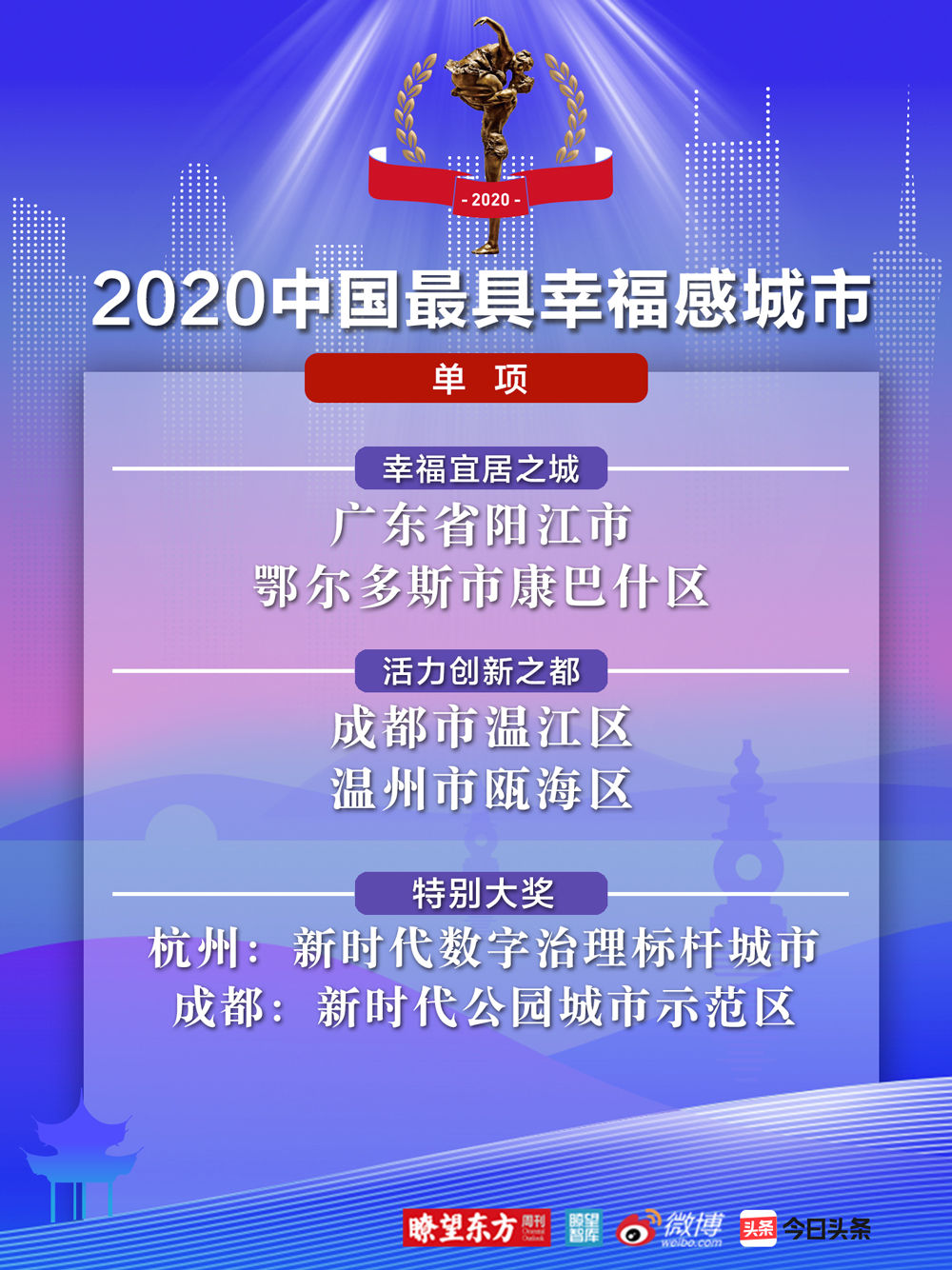 鑒于成都和杭州在城市治理方面的突出成就,組委會特別授予成都“新時代公園城市示范區(qū)”稱號、杭州 “新時代數(shù)字治理標(biāo)桿城市”稱號。另外,根據(jù)材料申報(bào)和大數(shù)據(jù)單項(xiàng)調(diào)查,廣東省陽江市、鄂爾多斯市康巴什區(qū)被評為“幸福宜居之城”,成都市溫江區(qū)、溫州市甌海區(qū)被評為“活力創(chuàng)新之都”。