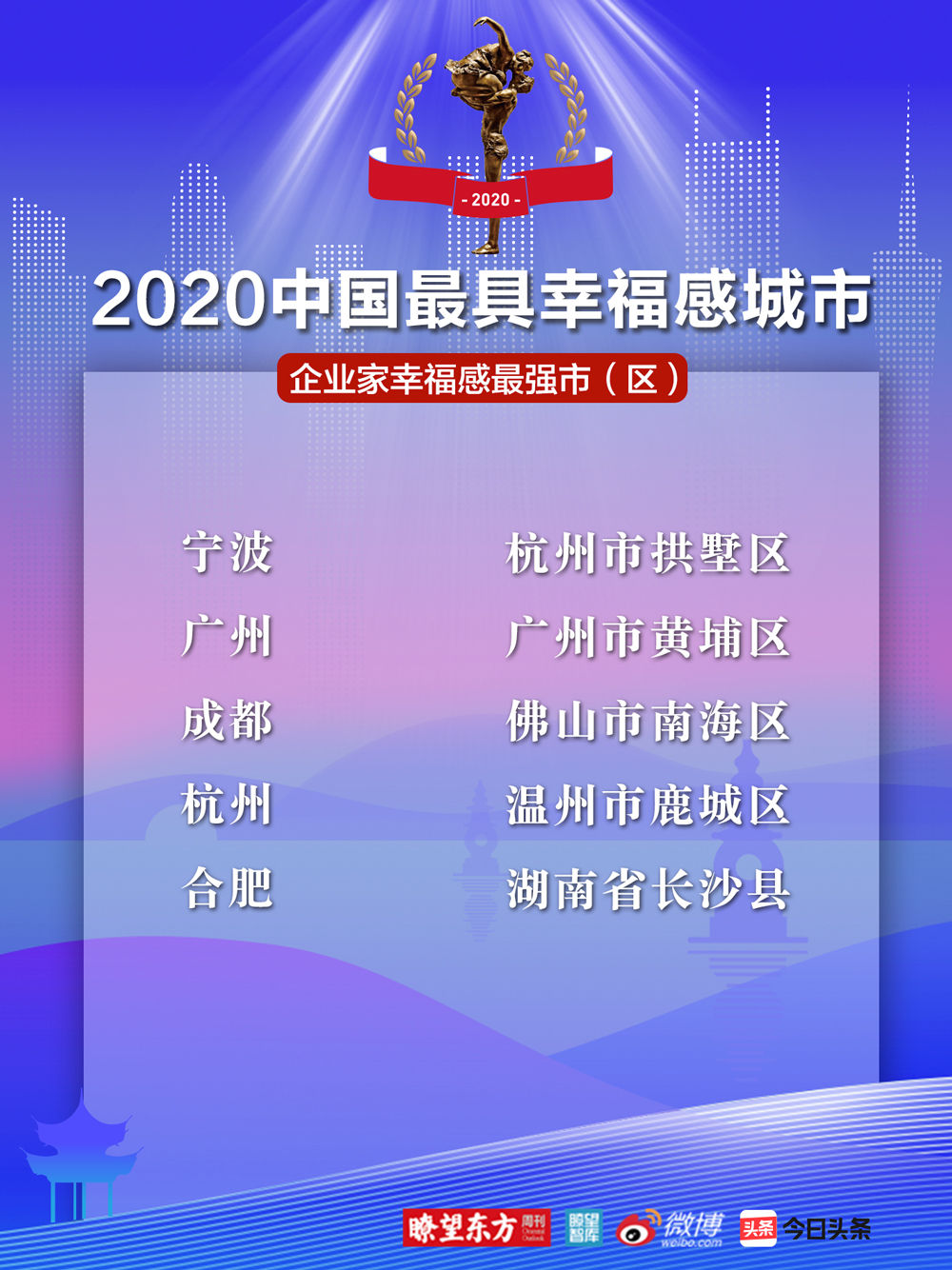 廣州市天河區(qū)、佛山市南海區(qū)、深圳市南山區(qū)、寧波市鄞州區(qū)、杭州市富陽區(qū)、溫州市鹿城區(qū)、廣州市黃埔區(qū)、寧波市鎮(zhèn)海區(qū)、舟山市普陀區(qū)、成都市雙流區(qū)被推選為“2020中國最具幸福感城區(qū)”。