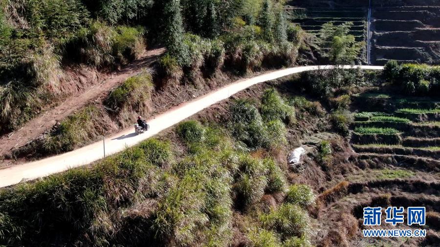 在江西省萬(wàn)載縣高村鎮(zhèn)新竹村,新竹小學(xué)的校長(zhǎng)羅長(zhǎng)石騎行在山路上(2月17日攝,無人機(jī)照片)。他要去最偏遠(yuǎn)的村組,給學(xué)生送當(dāng)天的線上教學(xué)課程。新華社記者 彭昭之 攝