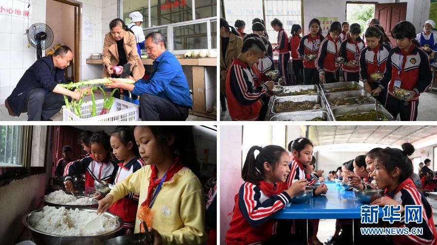 這是一張拼版照片。上左:在融水苗族自治縣東陽(yáng)村小學(xué),廚房師傅們?cè)跍?zhǔn)備營(yíng)養(yǎng)午餐;上右:東陽(yáng)村小學(xué)學(xué)生根據(jù)需要挑選菜肴。下左:東陽(yáng)村小學(xué)學(xué)生排隊(duì)打飯;下右:東陽(yáng)村小學(xué)學(xué)生在食用營(yíng)養(yǎng)午餐。近年來(lái),廣西在貧困地區(qū)大力推行學(xué)生營(yíng)養(yǎng)餐,幫助貧困學(xué)生健康成長(zhǎng)(2019年5月6日攝)。新華社記者 張愛(ài)林 攝