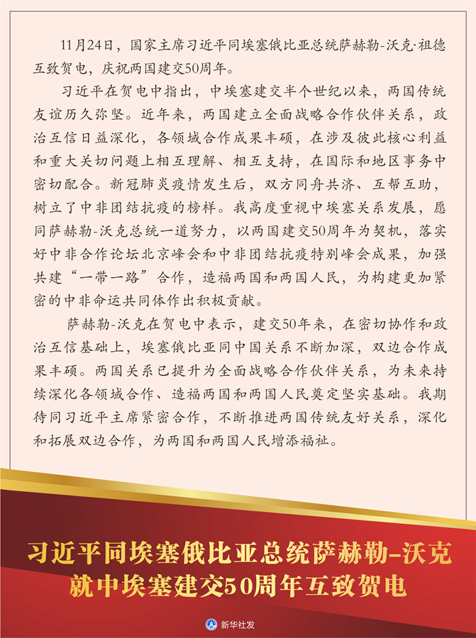 新華社北京11月24日電? 11月24日,國家主席習(xí)近平同埃塞俄比亞總統(tǒng)薩赫勒-沃克·祖德互致賀電,慶祝兩國建交50周年。