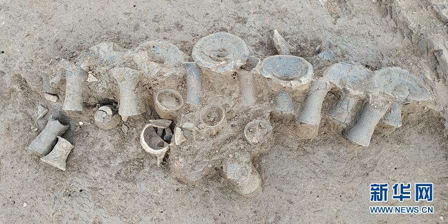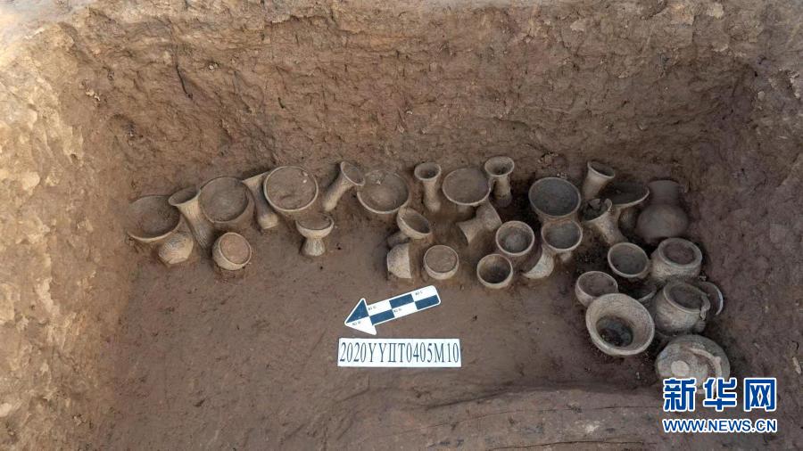 圖為河南葉縣余莊遺址標號為T0405的探方出土的陶器,該組陶器擺放有序,呈現出鮮明的禮制色彩(11月3日攝)。新華社發(fā)(河南省文物考古研究院供圖)