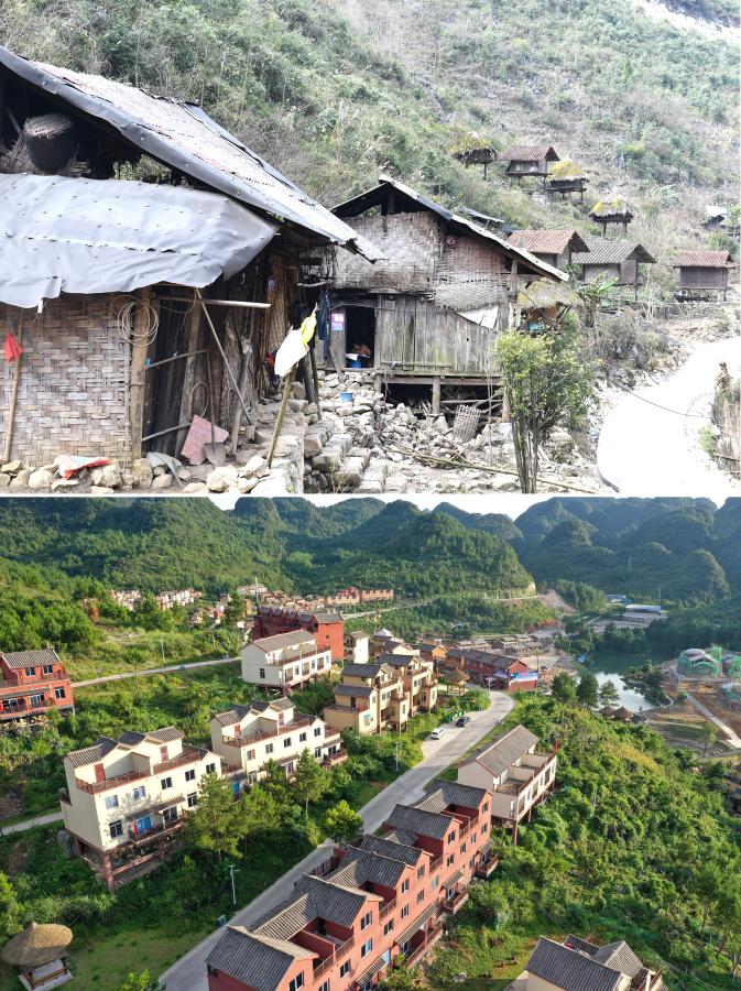 上圖為整屯搬遷前的廣西南丹縣里湖瑤族鄉(xiāng)董甲村么干屯(2018年1月10日攝),下圖為當(dāng)?shù)卮迕癜徇w后所在的“千家瑤寨·萬戶瑤鄉(xiāng)”里湖王尚易地扶貧搬遷安置點(diǎn)(8月4日攝,無人機(jī)照片)。新華社記者 周華 攝