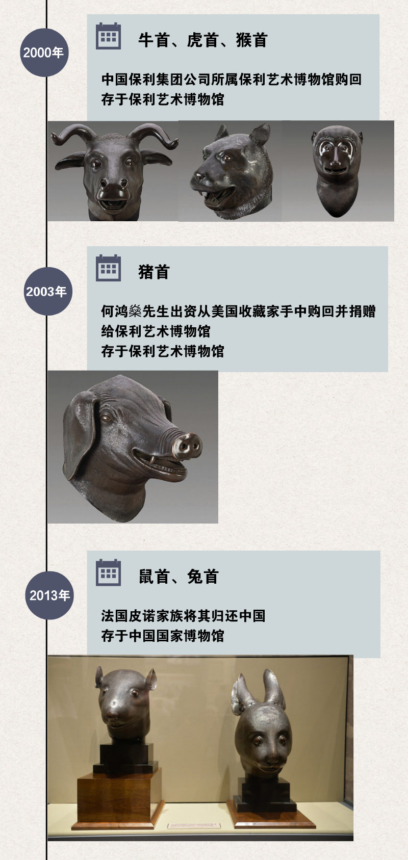 牛首、虎首、猴首、豬首、鼠首和兔首銅像都已通過不同方式回到祖國(guó)懷抱。2019年,它們和馬首銅像曾“相聚”在國(guó)家文物局主辦的“回歸之路—新中國(guó)成立70周年流失文物回歸成果展”。