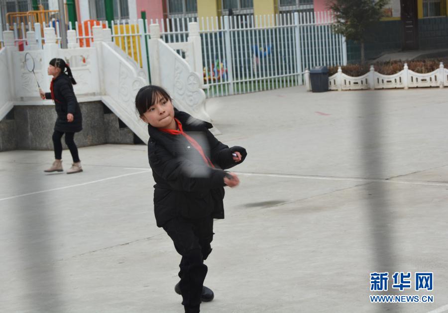 12月1日,在廣河縣三甲集鎮(zhèn)火炬小學的操場上,馬梅在課間和同學打羽毛球。新華社記者顏之宏攝