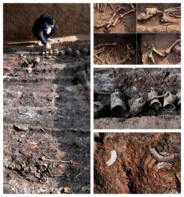 左圖為工作人員在清理河南洛陽徐陽墓地標(biāo)號為M15的墓葬;右上圖為河南洛陽徐陽墓地標(biāo)號為M15的墓葬周邊祭祀遺存內(nèi)出土的動物遺骸;右中圖為河南洛陽徐陽墓地標(biāo)號為M15的墓葬出土的編鐘;右下圖為河南洛陽徐陽墓地標(biāo)號為M15的墓葬出土的玉璜