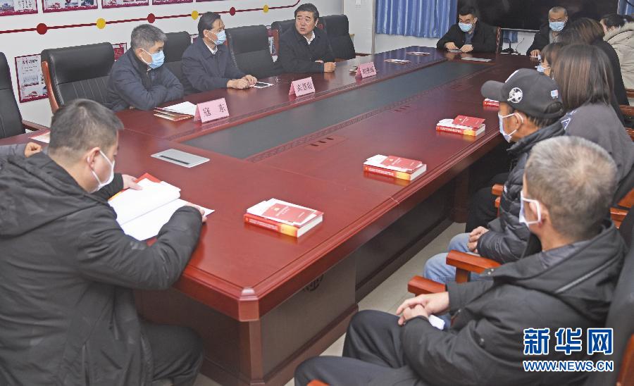 河北省委“走基層”宣講團成員、河北省社科院經(jīng)濟教研室主任劉來福(中)在廊坊市馨語星苑社區(qū)與基層干部群眾圍繞學習貫徹黨的十九屆五中全會精神開展座談交流(11月25日攝)。 新華社發(fā)