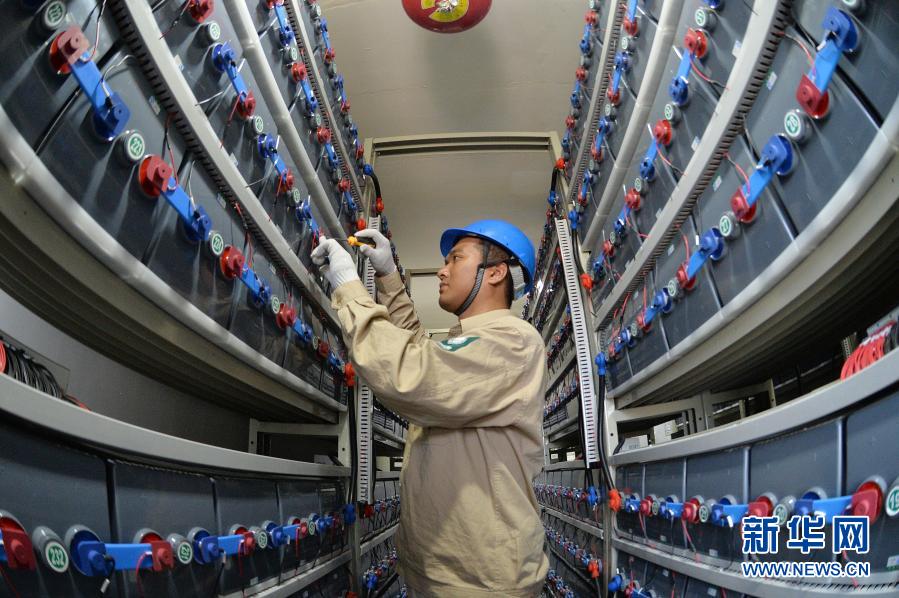 在江蘇省灌云縣開山島,國家電網(wǎng)的施工人員在調(diào)試“風(fēng)光儲互補(bǔ)智能微電網(wǎng)系統(tǒng)”的蓄電池組(2019年6月18日攝)。新華社發(fā)(萬程鵬 攝)