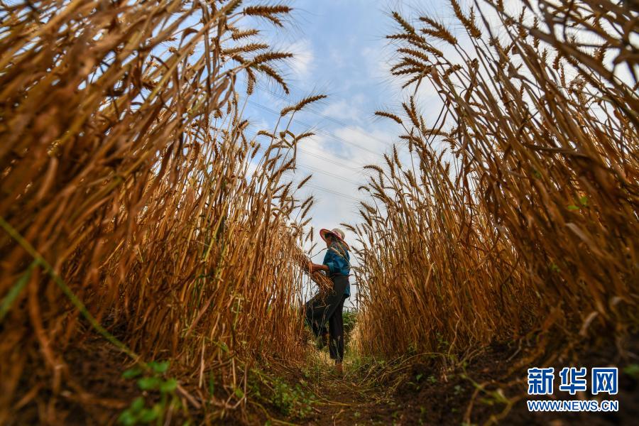 農(nóng)民在貴州省思南縣邵家橋鎮(zhèn)烏石村收割小麥(5月13日攝)。