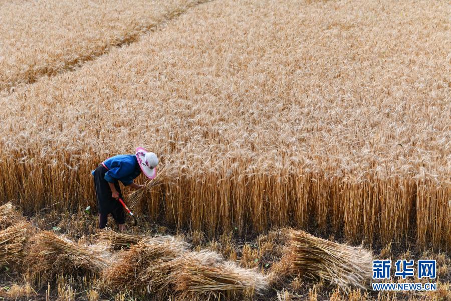 農(nóng)民在貴州省思南縣邵家橋鎮(zhèn)烏石村收割小麥(5月13日攝)。