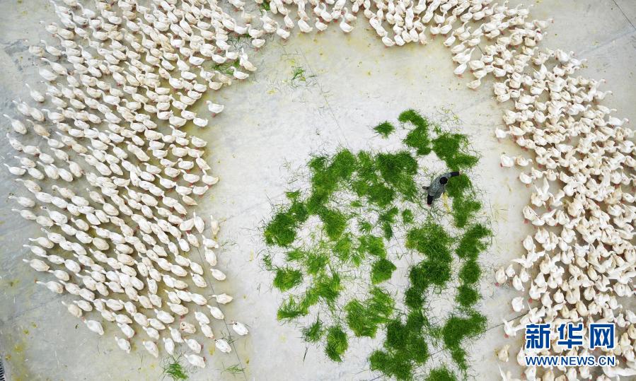 工人在貴州省黔東南苗族侗族自治州錦屏縣馬臺商品鵝養(yǎng)殖基地投放草料(3月11日攝,無人機(jī)照片)。新華社記者 楊文斌 攝