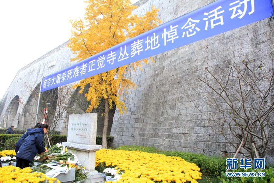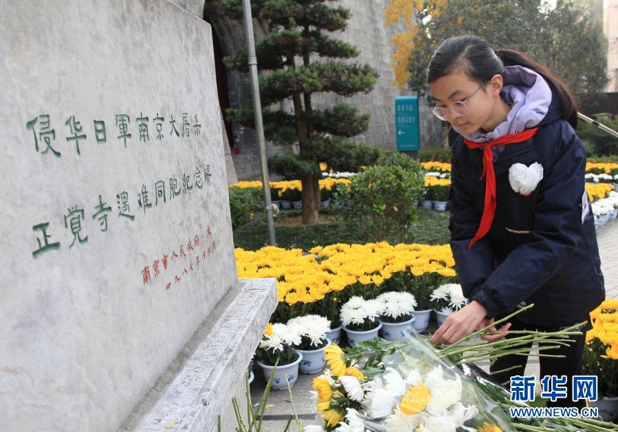 12月12日,在侵華日軍南京大屠殺死難同胞叢葬地(正覺寺),參加悼念活動(dòng)的小學(xué)生向遇難同胞紀(jì)念碑獻(xiàn)花。新華社發(fā)(劉建華 攝)