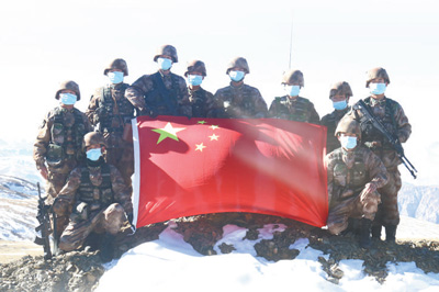 “里孜戍邊模范連”官兵巡邏到達(dá)界碑前,向國旗宣誓并合影留念。 鄔 軍攝