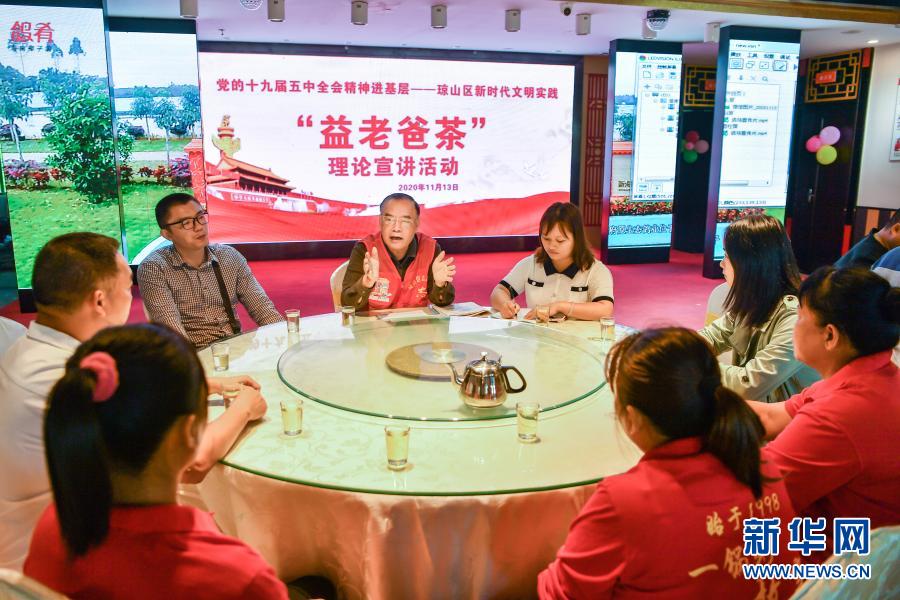11月13日,海南省??谑协偵絽^(qū)紅城湖邊的一家老爸茶館內,退休老干部郭仁忠在宣講黨的十九屆五中全會精神。新華社發(fā)(龍泉 攝)