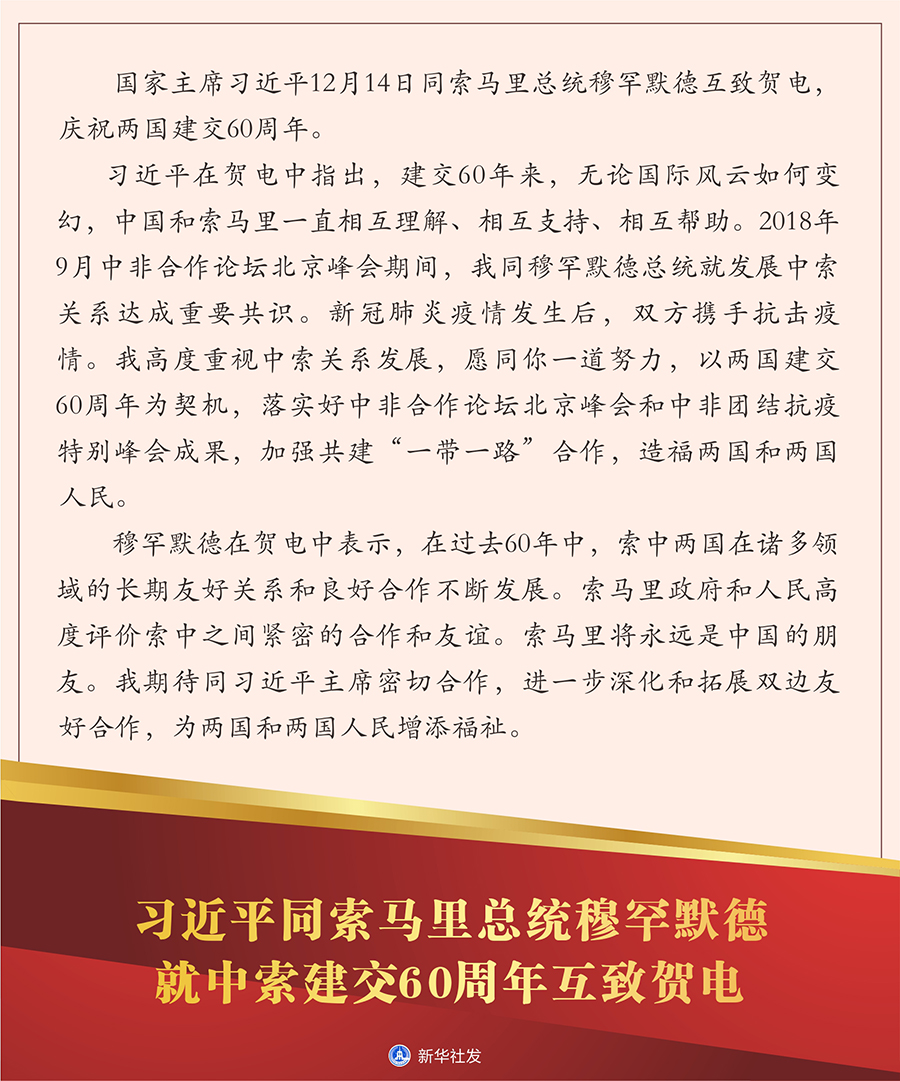 習(xí)近平在賀電中指出,建交60年來,無論國際風(fēng)云如何變幻,中國和索馬里一直相互理解、相互支持、相互幫助。2018年9月中非合作論壇北京峰會(huì)期間,我同穆罕默德總統(tǒng)就發(fā)展中索關(guān)系達(dá)成重要共識(shí)。新冠肺炎疫情發(fā)生后,雙方攜手抗擊疫情。我高度重視中索關(guān)系發(fā)展,愿同你一道努力,以兩國建交60周年為契機(jī),落實(shí)好中非合作論壇北京峰會(huì)和中非團(tuán)結(jié)抗疫特別峰會(huì)成果,加強(qiáng)共建“一帶一路”合作,造福兩國和兩國人民。