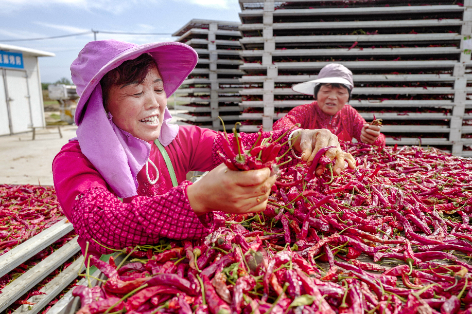 ????2018年拍攝于陜西興平桑鎮(zhèn)西橋村金鵬辣蒜專業(yè)合作社,農(nóng)民分揀辣椒,辣椒品質(zhì)優(yōu)良,農(nóng)民喜上眉梢。(組照2)張綺云 攝