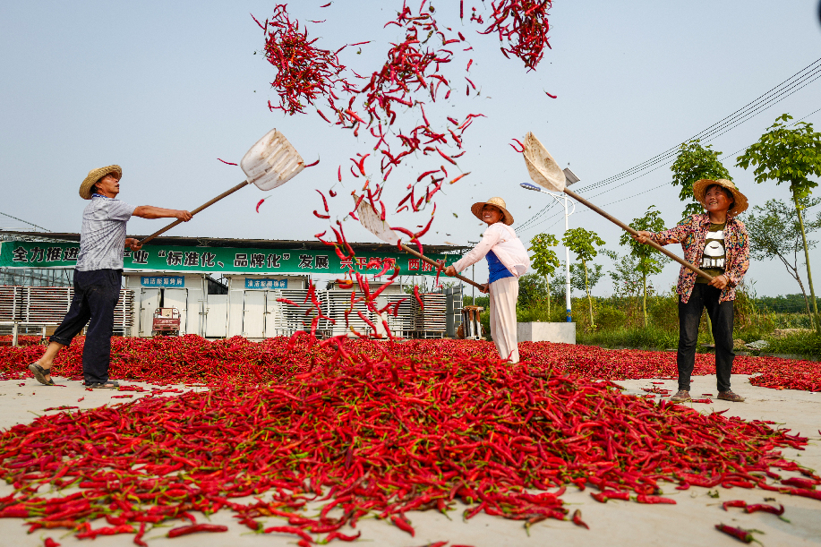 ??????2020年拍攝于陜西興平桑鎮(zhèn)西橋村金鵬辣蒜專業(yè)合作社,農(nóng)民將辣椒揚起晾曬。(組照4)張綺云 攝