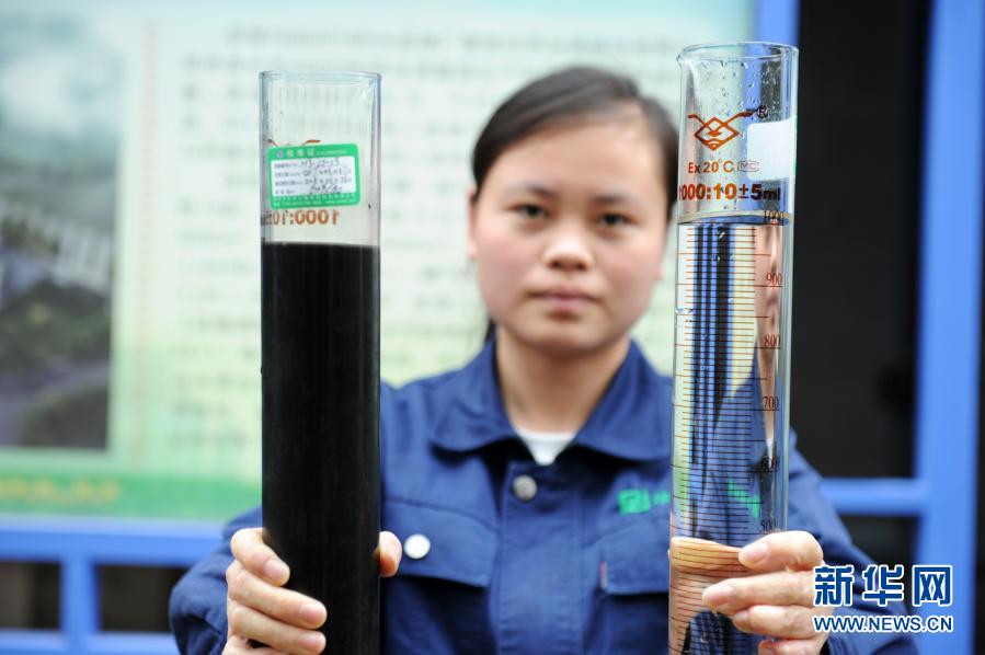 貴州省仁懷市茅臺(tái)酒廠(chǎng)污水處理廠(chǎng)的工人展示污水處理前后的水質(zhì)對(duì)比效果(2018年10月23日攝)。新華社記者 楊文斌 攝