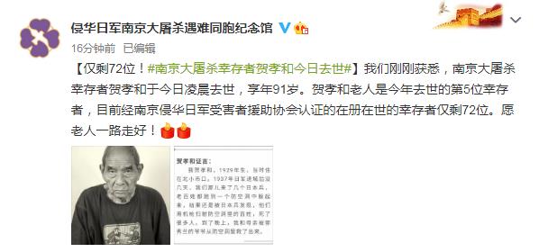 據(jù)侵華日軍南京大屠殺遇難同胞紀(jì)念館官方微博消息,南京大屠殺幸存者賀孝和于今日凌晨去世,享年91歲。賀孝和老人是今年去世的第5位幸存者,目前經(jīng)南京侵華日軍受害者援助協(xié)會(huì)認(rèn)證的在冊(cè)在世的幸存者僅剩72位。