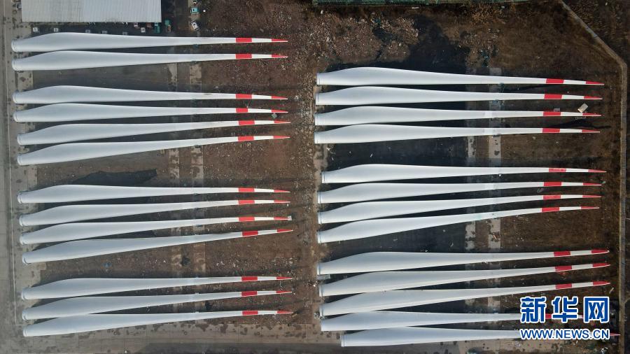 這是河北省威縣一家風電設施生產(chǎn)企業(yè)內(nèi)的大型風電機組葉片(12月8日攝,無人機照片)。新華社記者 牟宇 攝