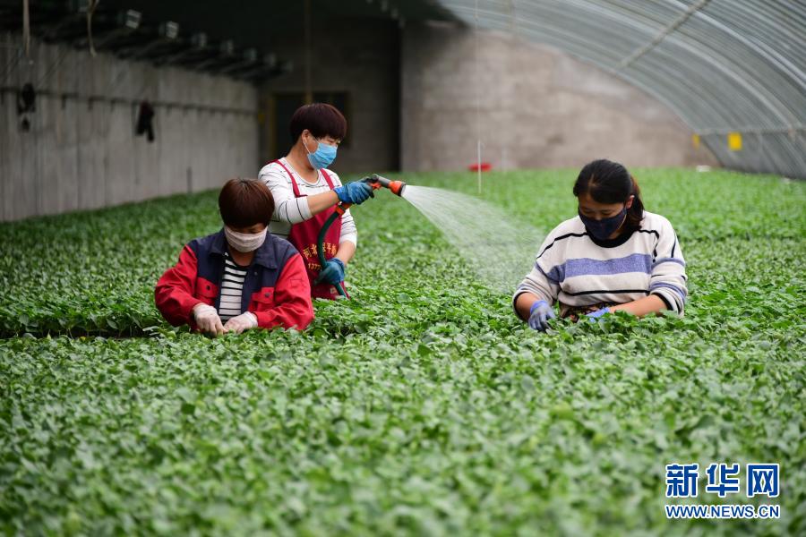 河北曲周縣一家育苗產(chǎn)業(yè)基地的工人在育苗溫棚內(nèi)工作(5月4日攝)。曲周縣積極拓寬產(chǎn)業(yè)扶貧渠道,發(fā)揮當?shù)禺a(chǎn)業(yè)優(yōu)勢,統(tǒng)籌協(xié)調(diào)貧困戶利用扶貧資金入股現(xiàn)代設施農(nóng)業(yè)基地,帶動群眾脫貧增收。新華社記者 朱旭東 攝