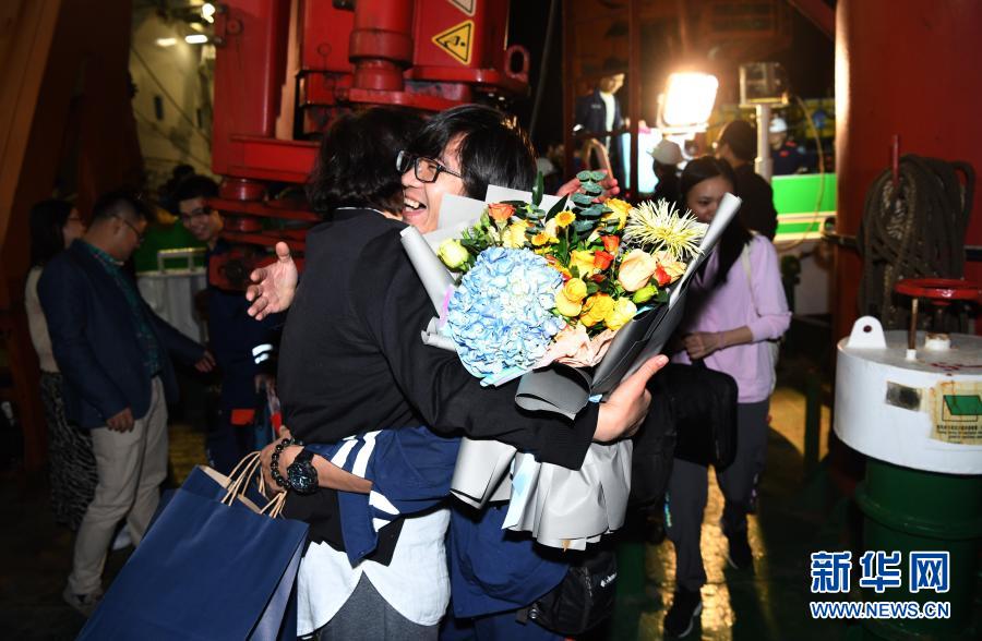12月21日,“奮斗者”號海試保障母船“探索二號”靠泊三亞,科考隊員和前來迎接的家屬一起離船。新華社記者 趙穎全 攝