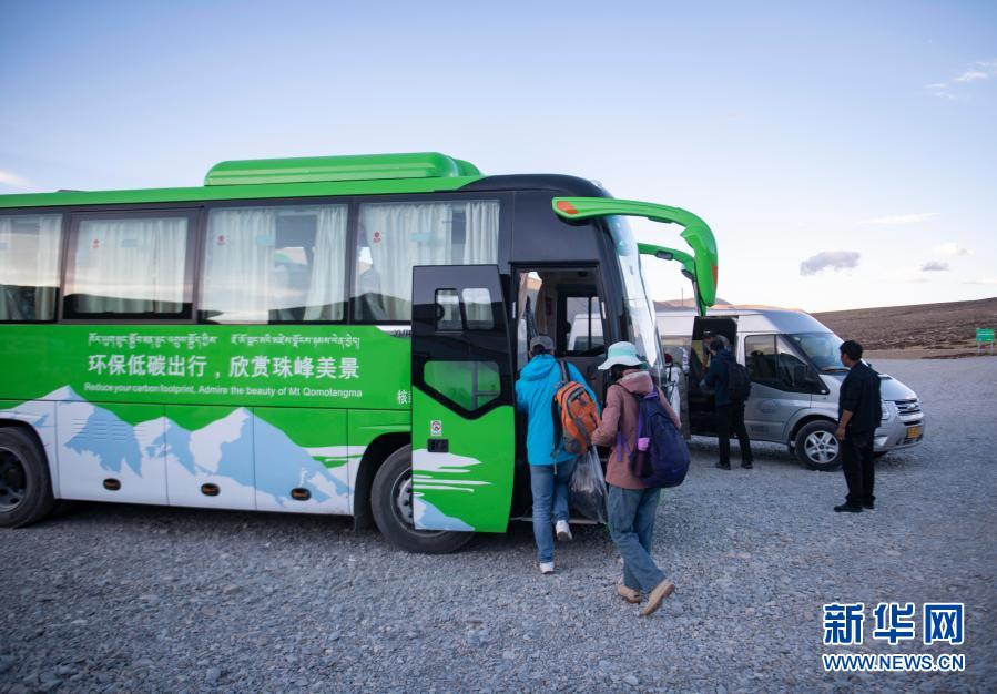 游客在珠穆朗瑪峰景區(qū)停車場(chǎng)轉(zhuǎn)乘環(huán)??蛙嚕?019年5月16日攝)。珠穆朗瑪峰景區(qū)內(nèi)自2019年5月開始試運(yùn)營(yíng)清潔能源環(huán)??蛙?,以進(jìn)一步平衡珠峰地區(qū)旅游發(fā)展與環(huán)境保護(hù)需要。新華社記者 孫非 攝