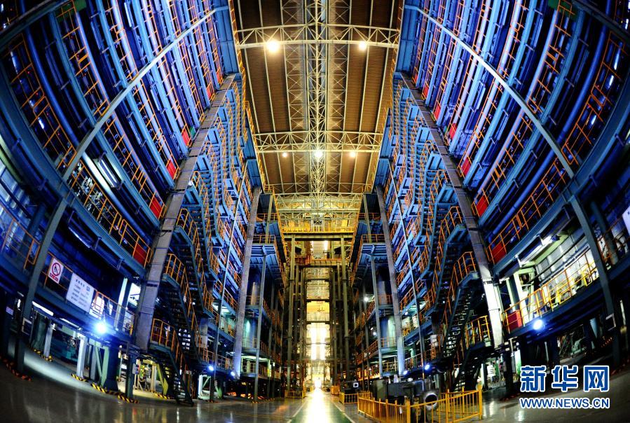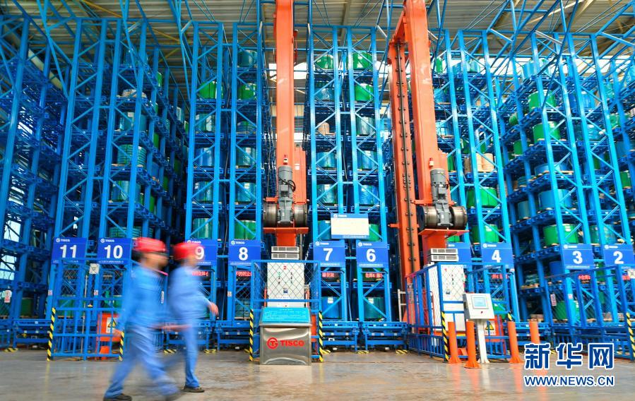 太鋼集團(tuán)員工走過超薄帶狀不銹鋼立體倉庫(2019年5月24日攝)。新華社記者 曹陽 攝