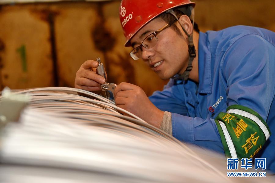 太鋼集團(tuán)的質(zhì)檢人員在檢驗(yàn)“筆尖鋼”鋼絲的質(zhì)量(2017年1月10日攝)。新華社記者 曹陽 攝