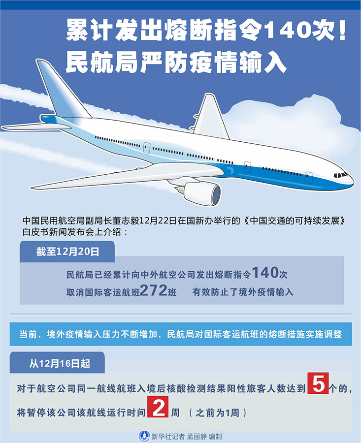 新華社北京12月22日電(記者周圓、魏玉坤)中國(guó)民用航空局副局長(zhǎng)董志毅22日在國(guó)新辦舉行的《中國(guó)交通的可持續(xù)發(fā)展》白皮書(shū)新聞發(fā)布會(huì)上介紹,截至12月20日,民航局已經(jīng)累計(jì)向中外航空公司發(fā)出熔斷指令140次,取消國(guó)際客運(yùn)航班272班,有效防止了境外疫情輸入。
