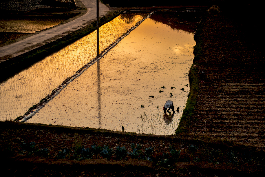 ????云南省南華縣龍川鎮(zhèn)二街社區(qū)位于城鎮(zhèn)南部31公里的山區(qū),平均海拔1780米。2019年5月12日下午,拍攝者從二街社區(qū)田間地頭了解村民生活情況,返回時(shí),正好夕陽西下,水田地里,霞光、水、人構(gòu)成和諧、美好的畫卷。 傅敢峰 攝
