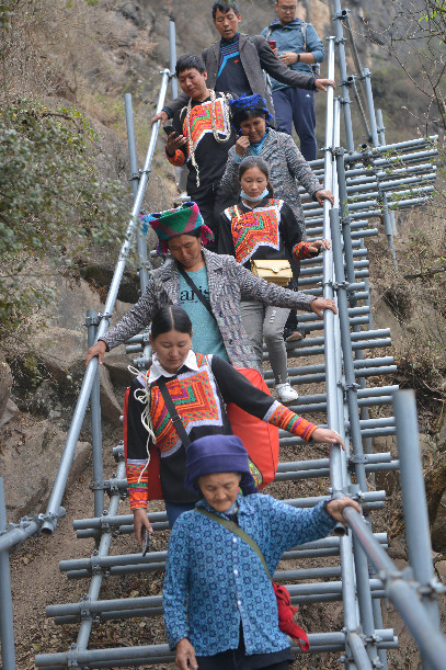 ????2020年5月13日,四川省涼山州昭覺縣支爾莫鄉(xiāng)阿土列爾村31戶村民帶著行李通過鋼梯下山,集中搬遷至昭覺縣易地扶貧搬遷縣城集中安置點的新家。阿土列爾村因位于垂直落差上千米的陡峭懸崖上,曾經(jīng)村民上下山都要在巖壁上攀爬,從而被稱為“懸崖村”。5月14日前,全村84戶建檔立卡貧困戶將陸續(xù)搬進縣城新家。張浪 攝