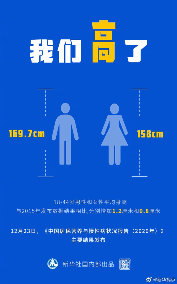 你的營養(yǎng)和健康情況怎樣?高了?身體倍棒?12月23日,一份關(guān)乎你我的健康大數(shù)據(jù)重磅上新,《中國居民營養(yǎng)與慢性病狀況報告(2020年)》主要結(jié)果發(fā)布——成人平均身高繼續(xù)增長,營養(yǎng)不足問題得到改善,健康意識逐步增強(qiáng)。(記者:陳聰,海報設(shè)計:張晨光) ????